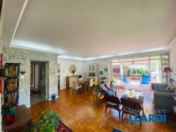 Casa modernista construída nos anos 60 recentemente atualizada por renomados arquitetos que mantiveram todos os detalhes originais de época, desde o impecável piso de parquet de madeira, até as pedras de quartzo branco, louças inglesas de ágata, pisos de mármore restaurados, um bar de madeira nobre de época super charmoso, uma copa/cozinha com armários impecáveis, pisos originais restaurados. Na parte de cima há um imenso salão de estar com lareira, banheiro e um bar e cozinha de apoio. Os quartos são muito amplos e arejados com janelões. Garagem para 6 carros mais um espaço para um atelier ou oficina em anexo. Área de serviço, quartos para staff que são separados da casa para mais privacidade. Um charmoso pátio com mesas e cadeiras e deliciosas espreguiçadeiras. Tudo isso em meio a um exuberante jardim. Segurança total com uma guarita do outro lado da rua.